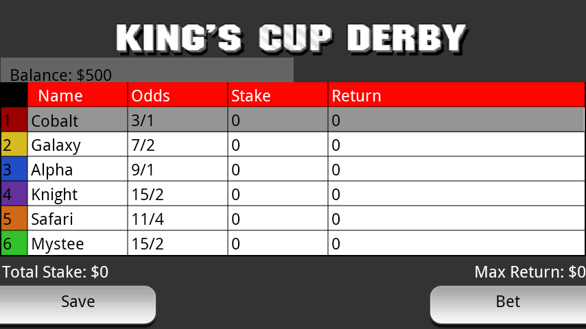 Race around the clock at the King's Cup Derby, for non stop racing action. Study the horses, their history and the odds to bet on winners and collect more virtual cash than any other punter. The gates are up....Place your bet!